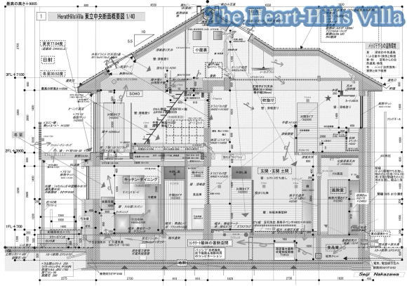 《※採光計画と伴に、天窓より高い位置に排気筒を設置することで、夏、天窓を直撃する直射日光による灼熱を、その排気筒から外に排熱・排出させるパッシブデザイン(熱の道)を行う。「熱」を遠ざけ、そして外の暑さを室内に入れない(屋内の生活空間まで落とさな)パッシブデザインを行う。》
