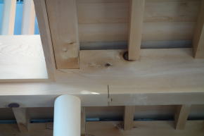 天井には、梁がそのまま意匠に使われる「あらわし仕上げ」の化粧仕上げを組み入れる。その意図は、木は線材として組合せ、その断面が分かるような陰影ある使用術で、木材らしさを生かす。