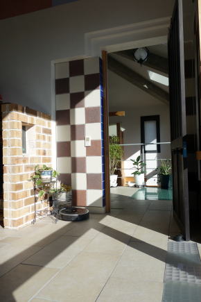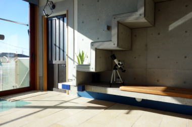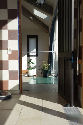 (5) 土間床(蓄熱体)を直接的、間接的(木造床を土間床の上に架け、間に空気を循環させる等)に活用、さらにテラコッタ仕上げ等の「蓄熱床」で建物自体の「熱容量」を多く確保し、「集熱」 「蓄熱」したエネルギーを輻射放熱して利用する。